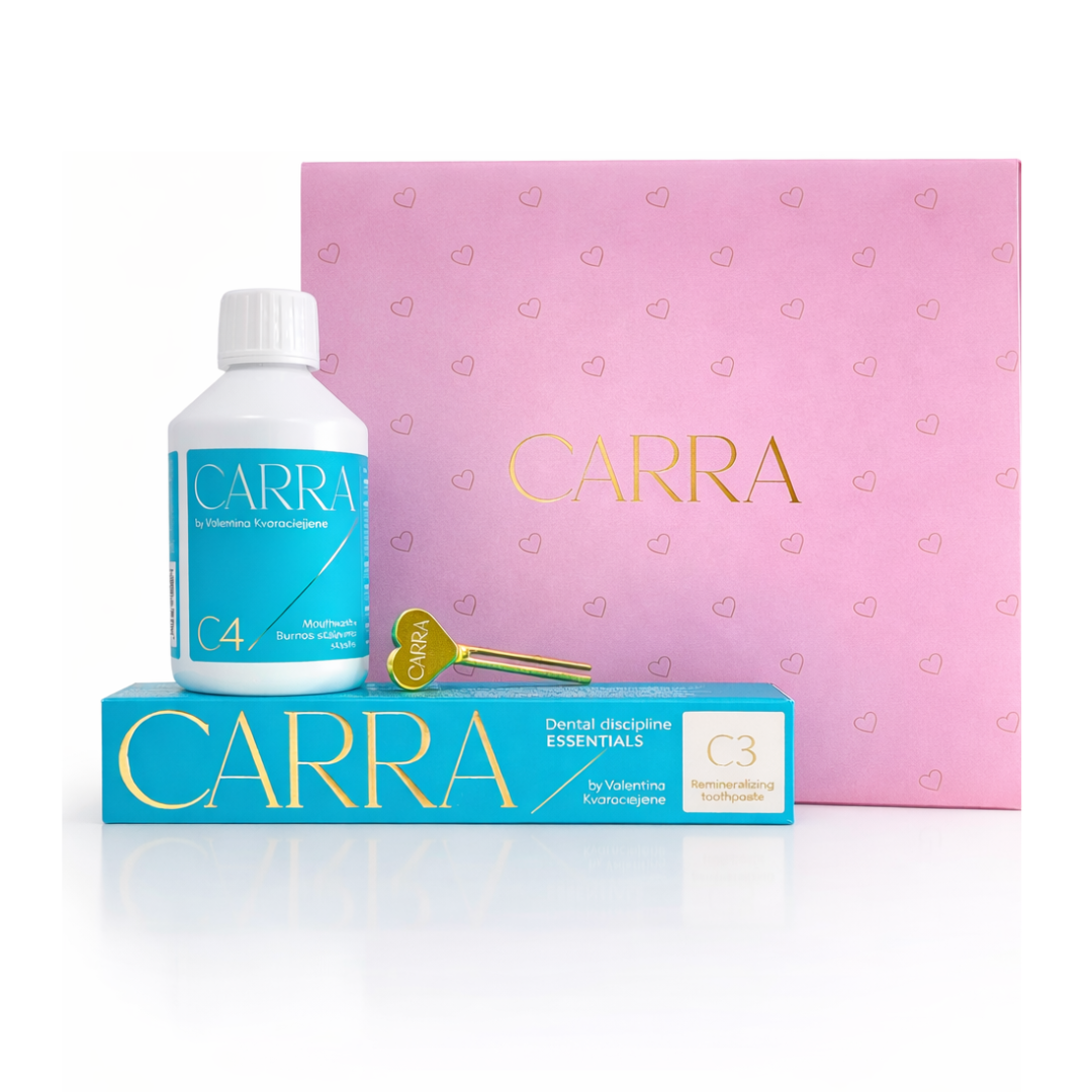Rinkinį sudaro CARRA C3 remineralizuojanti dantų pasta, CARRA C4 burnos skalavimo skystis ir CARRA dantų pastos spaustukas. Šis rinkinys padės pasirūpinti kasdiene dantų disciplina.